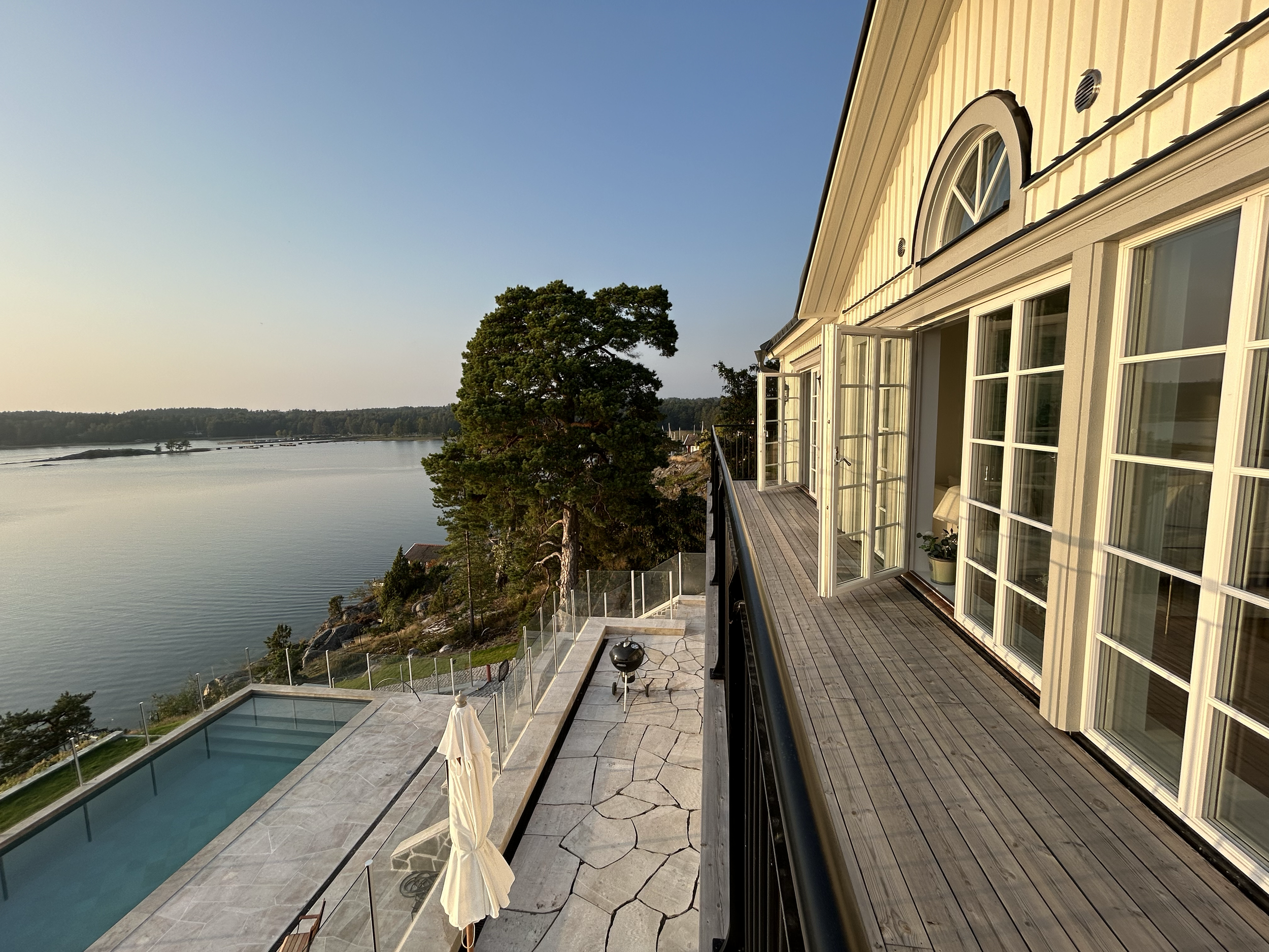 The house holds seven bedrooms and seven bathrooms, along with generous spaces to gather, rest, and simply be. Multiple terraces open toward the sea, a private dock leads you straight into the water, and two saunas offer that deeply grounding Nordic ritual of heat and cold, warmth and release. There’s also a heated pool, cozy corners to curl up with a cup of tea, and long tables made for shared meals and meaningful, unhurried conversations.